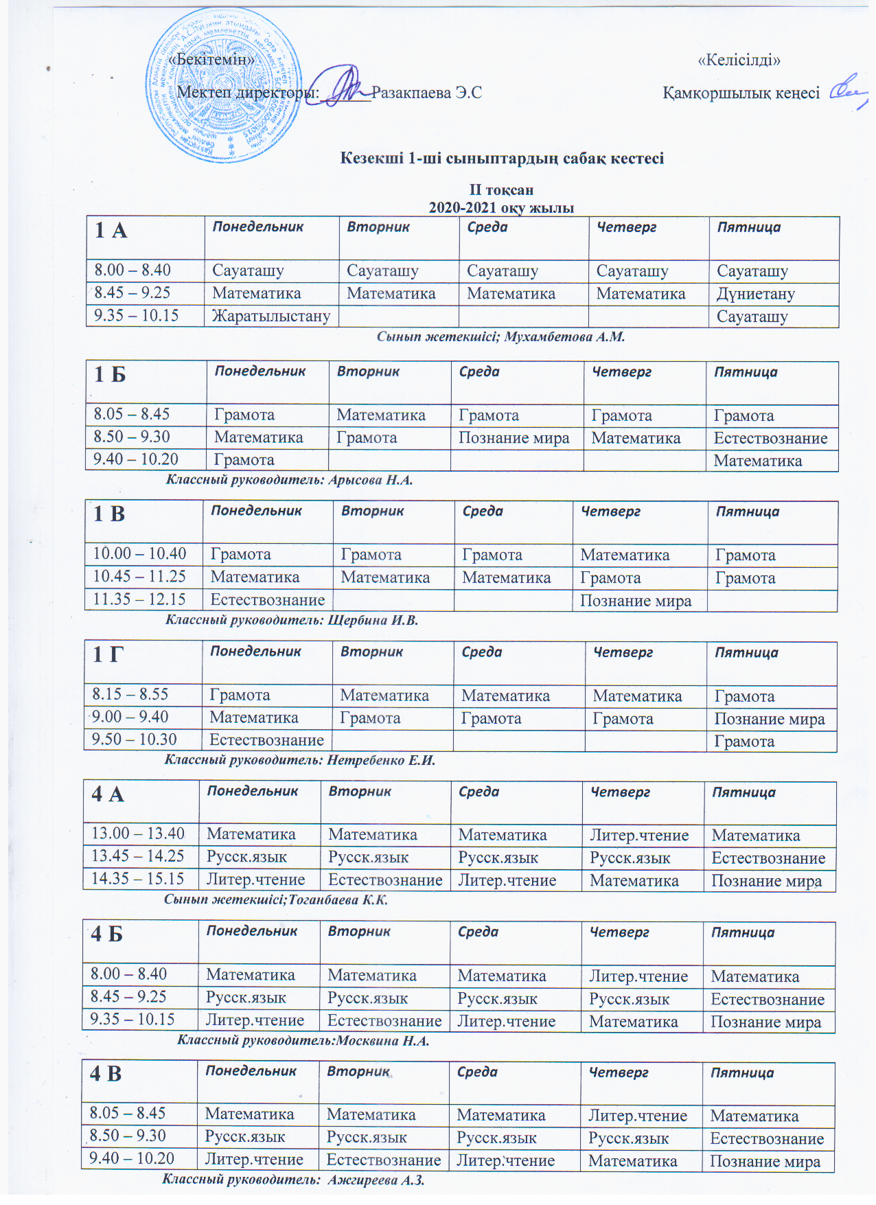 Кезекші 1-ші сыныптардың II тоқсан сабақ кестесі
