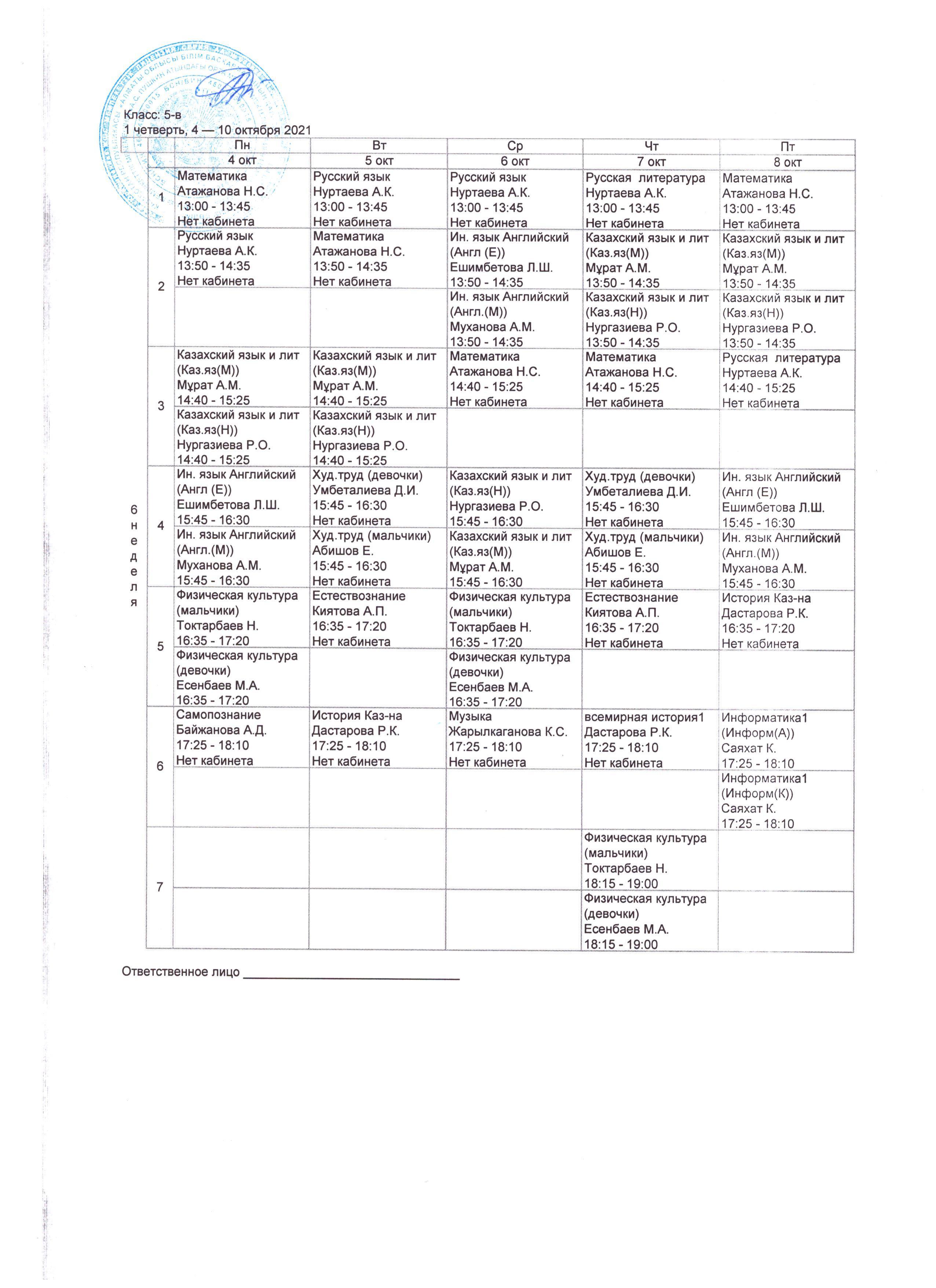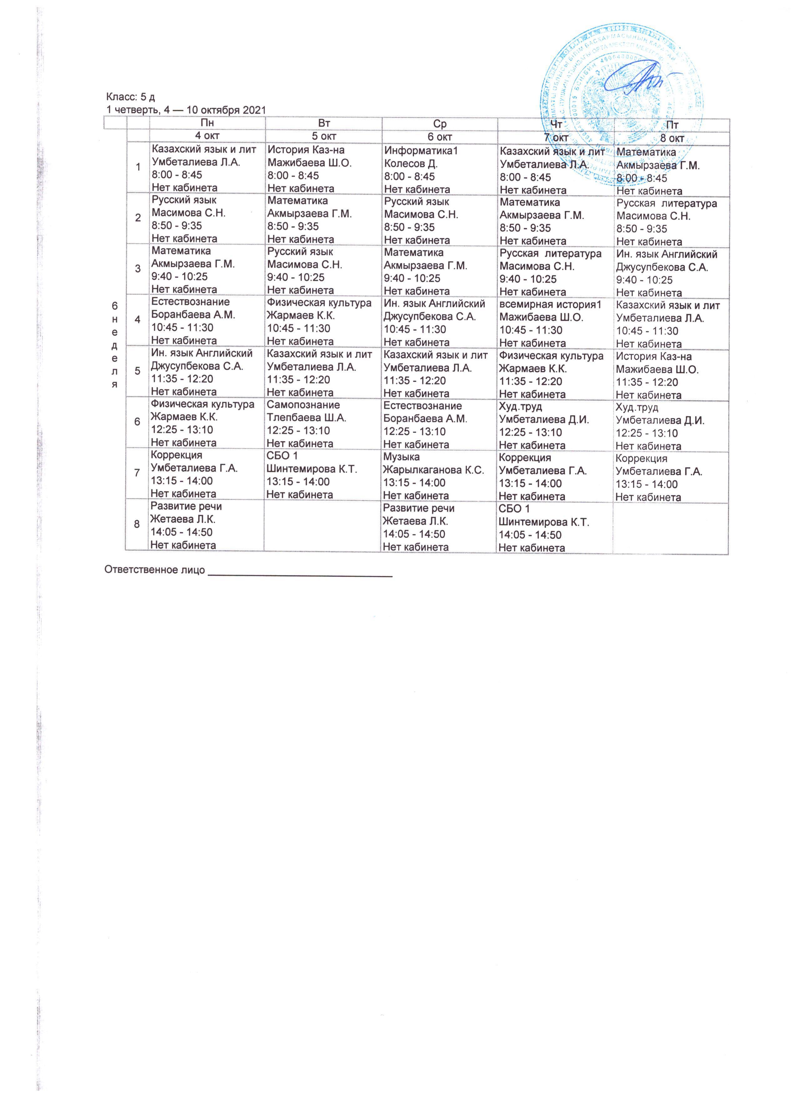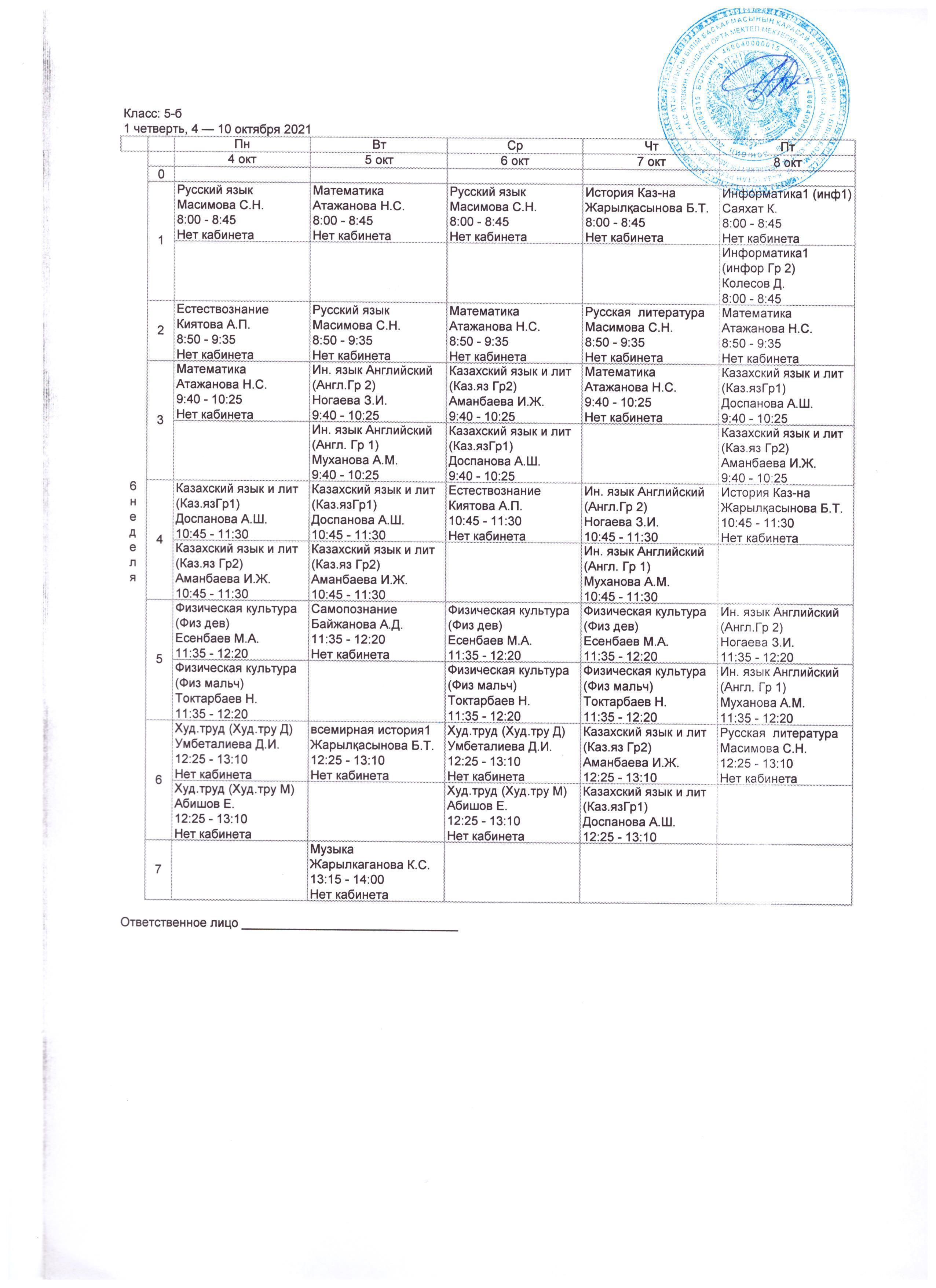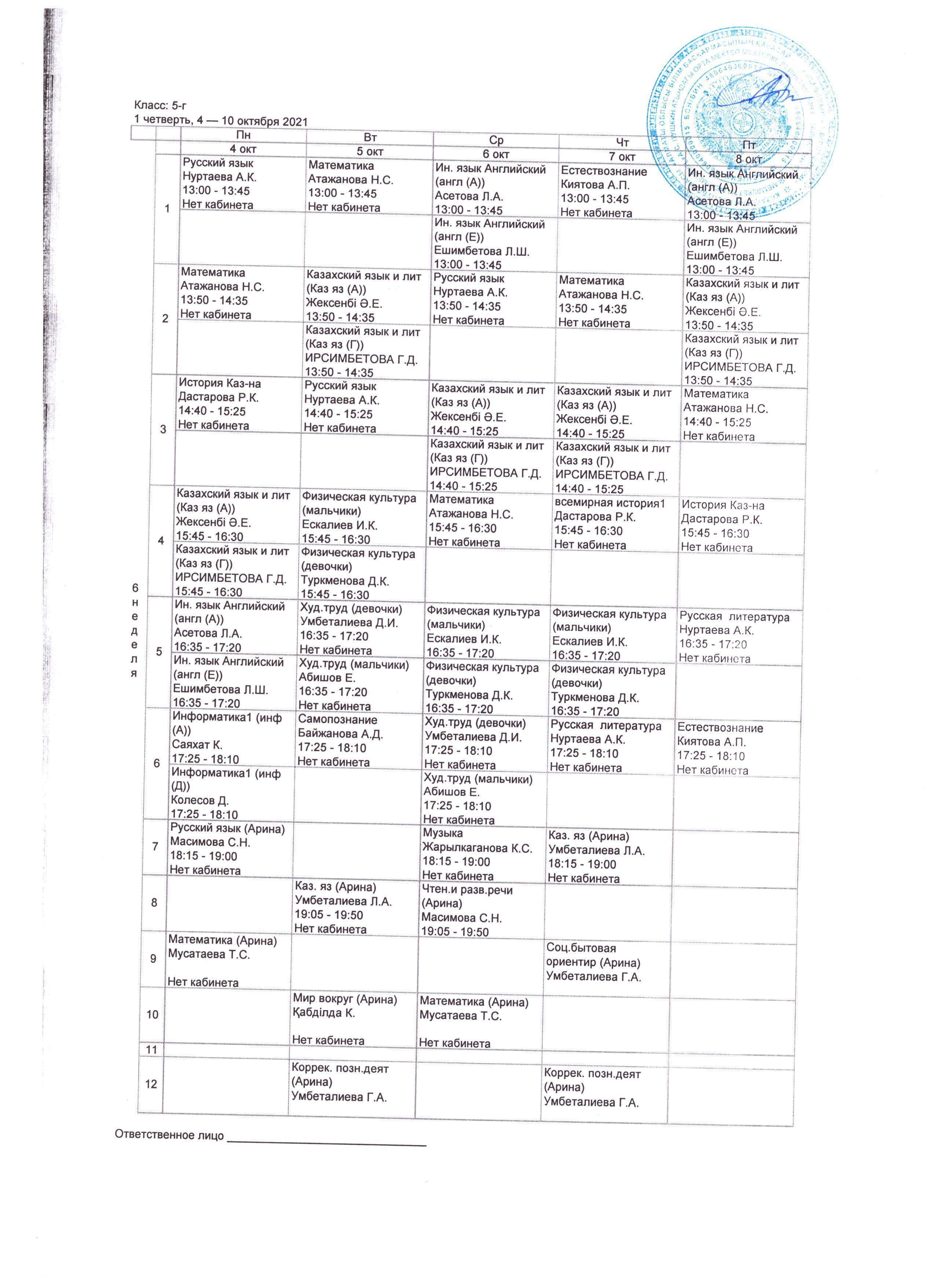 Сабақ кестесі: 5 сынып, 2021-2022 оқу жылы