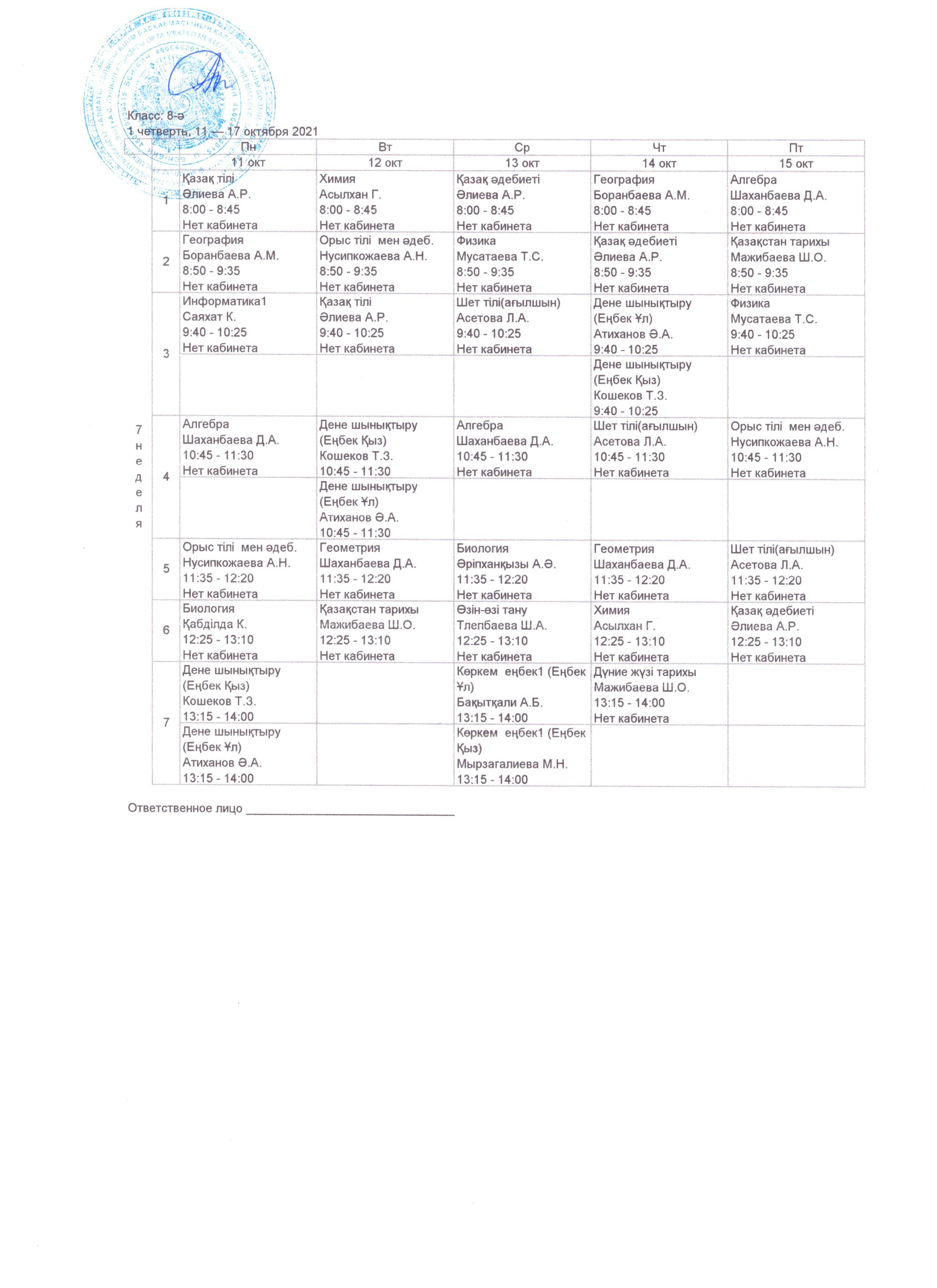 Сабақ кестесі: 8 сынып, 2021-2022 оқу жылы