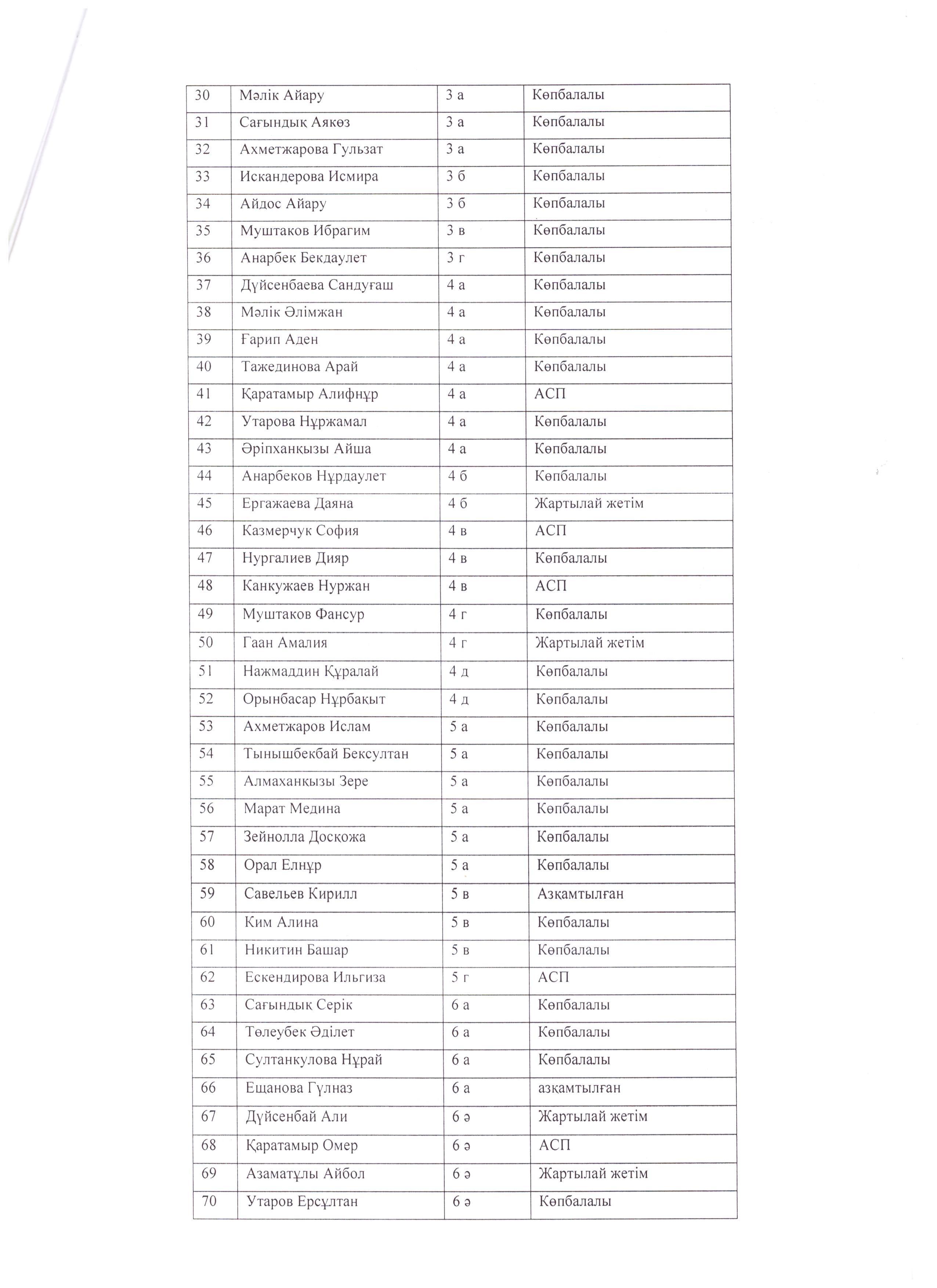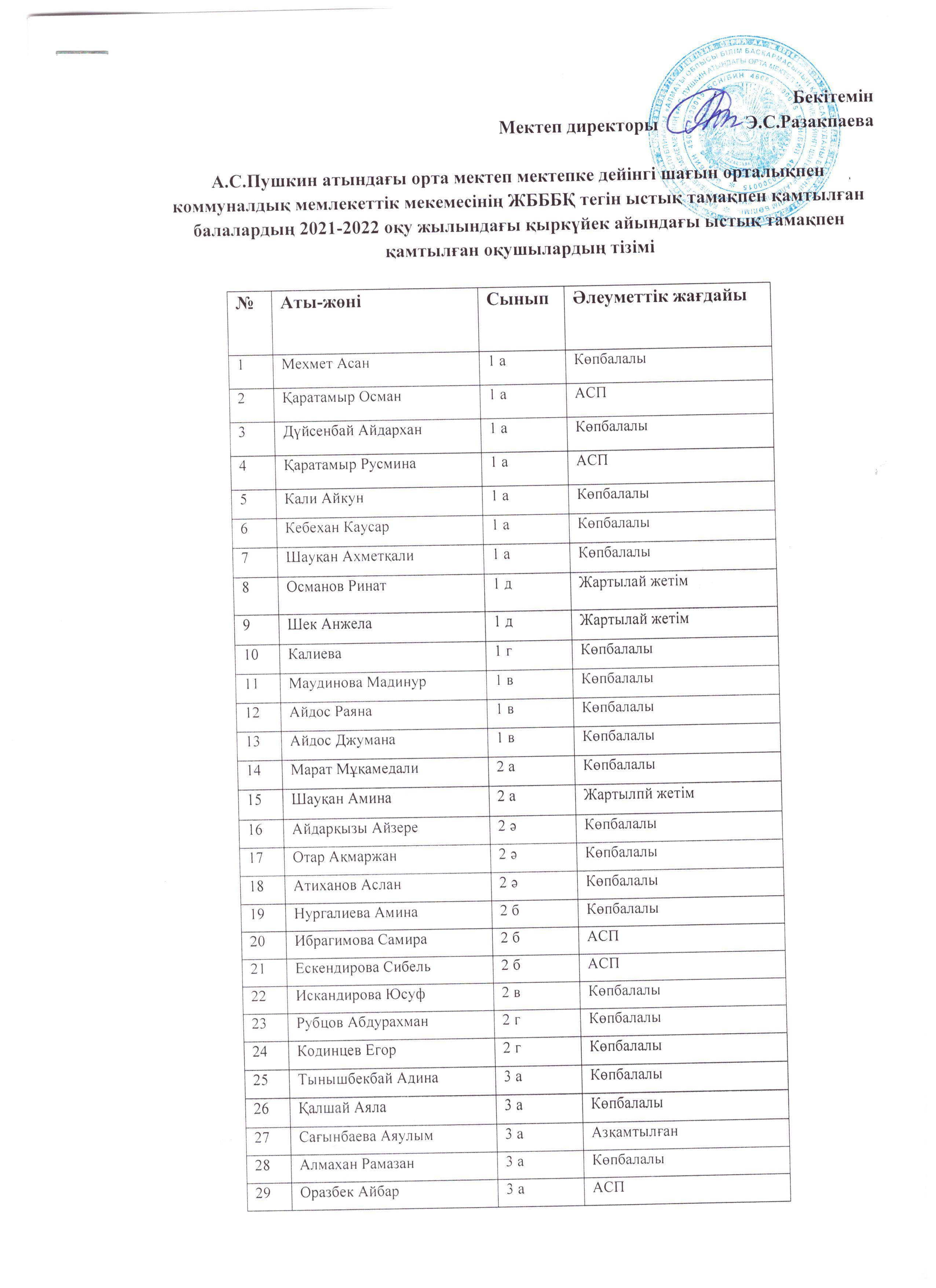 2021-2022 оқу жылындағы ыстық тамақпен қамтылған оқушылар тізімі » "Алматы облысы білім басқармасының Қарасай ауданы бойынша білім бөлімі"мемлекеттік мекемесінің "А.С.Пушкин атындағы орта мектеп " коммуналдық мемлекеттік мекемесі