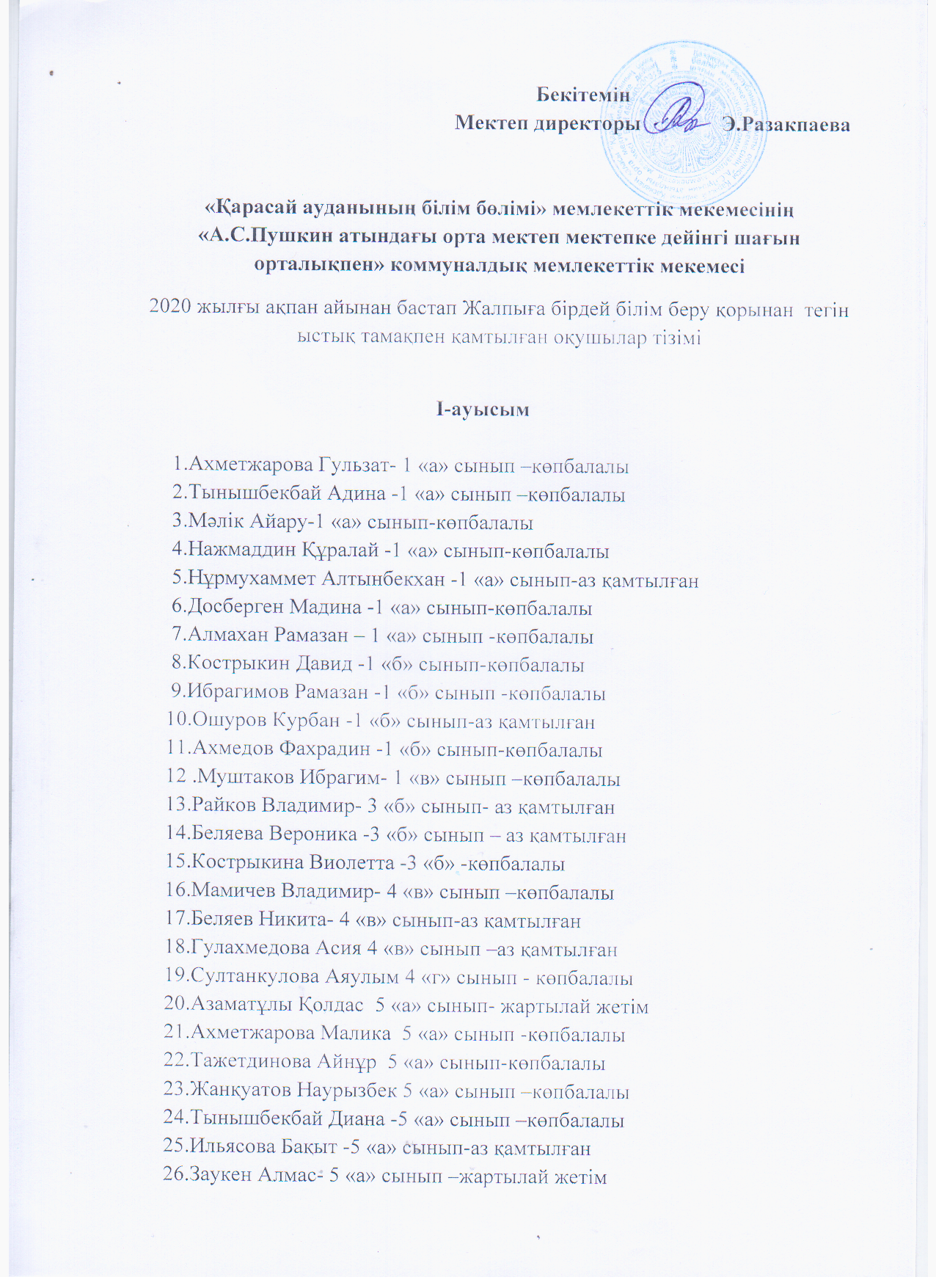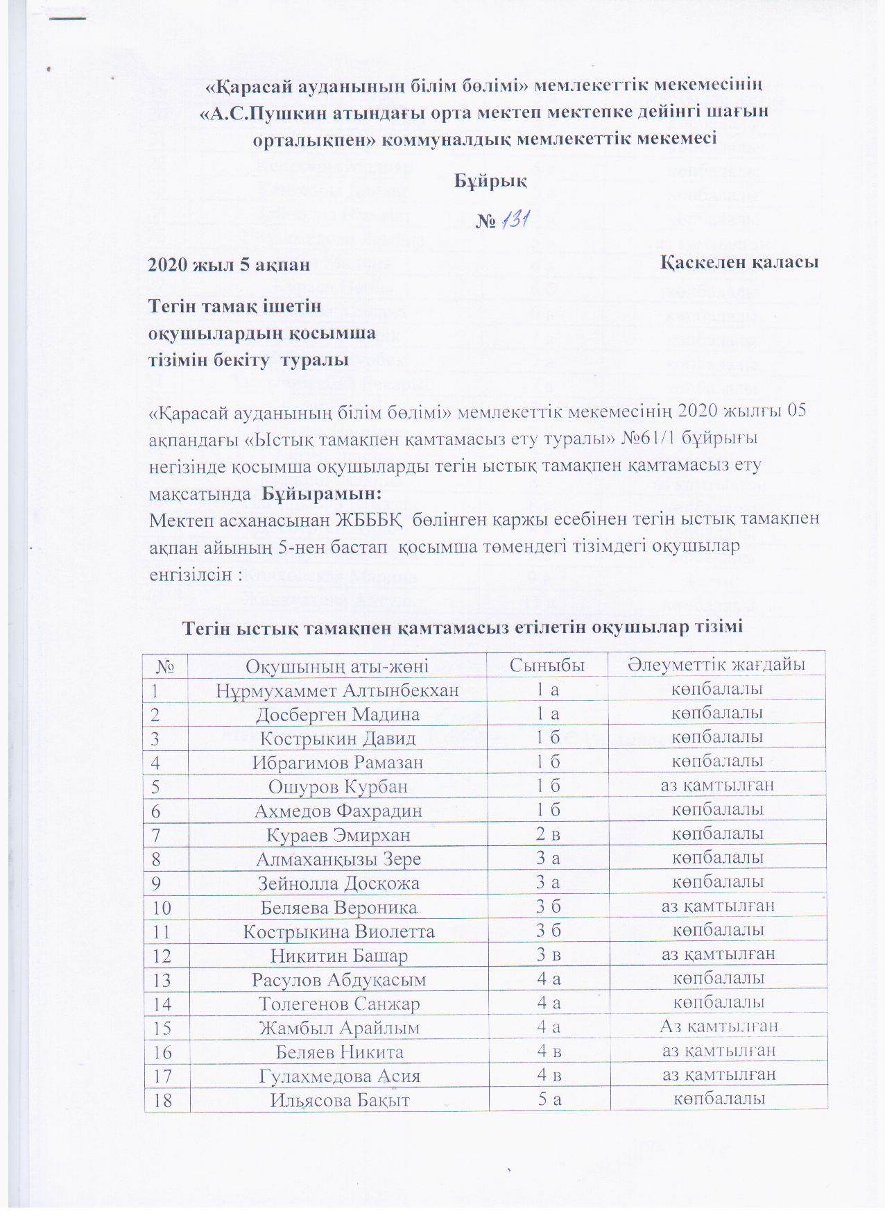 Ыстық тамақпен қамтамасыз ету » "Алматы облысы білім басқармасының Қарасай ауданы бойынша білім бөлімі"мемлекеттік мекемесінің "А.С.Пушкин атындағы орта мектеп " коммуналдық мемлекеттік мекемесі