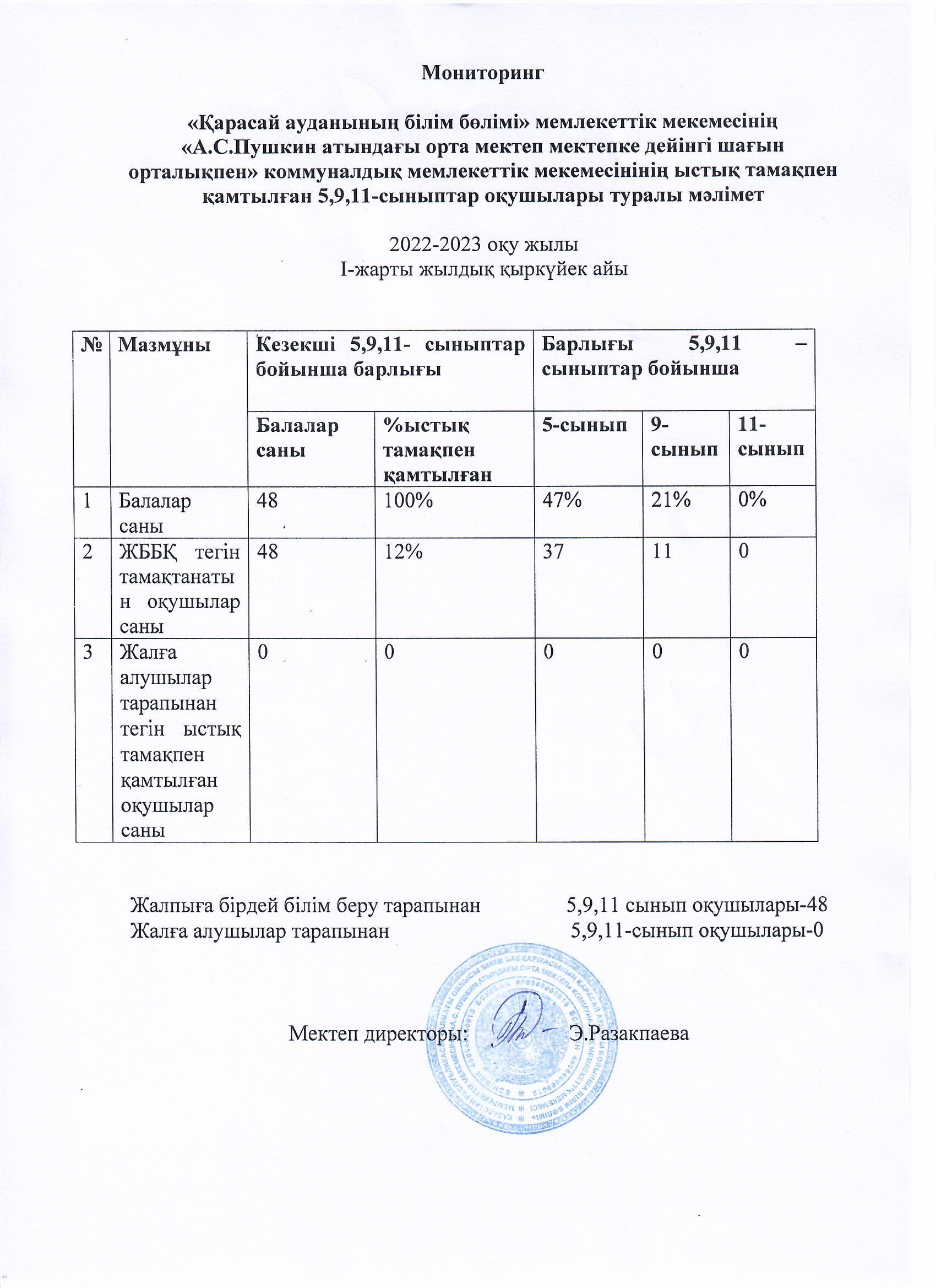 Ыстық тамақпен қамтылған 5,9,11 сыныптар о0ушылары туралы мәлімет. » "Алматы облысы білім басқармасының Қарасай ауданы бойынша білім бөлімі"мемлекеттік мекемесінің "А.С.Пушкин атындағы орта мектеп " коммуналдық мемлекеттік мекемесі