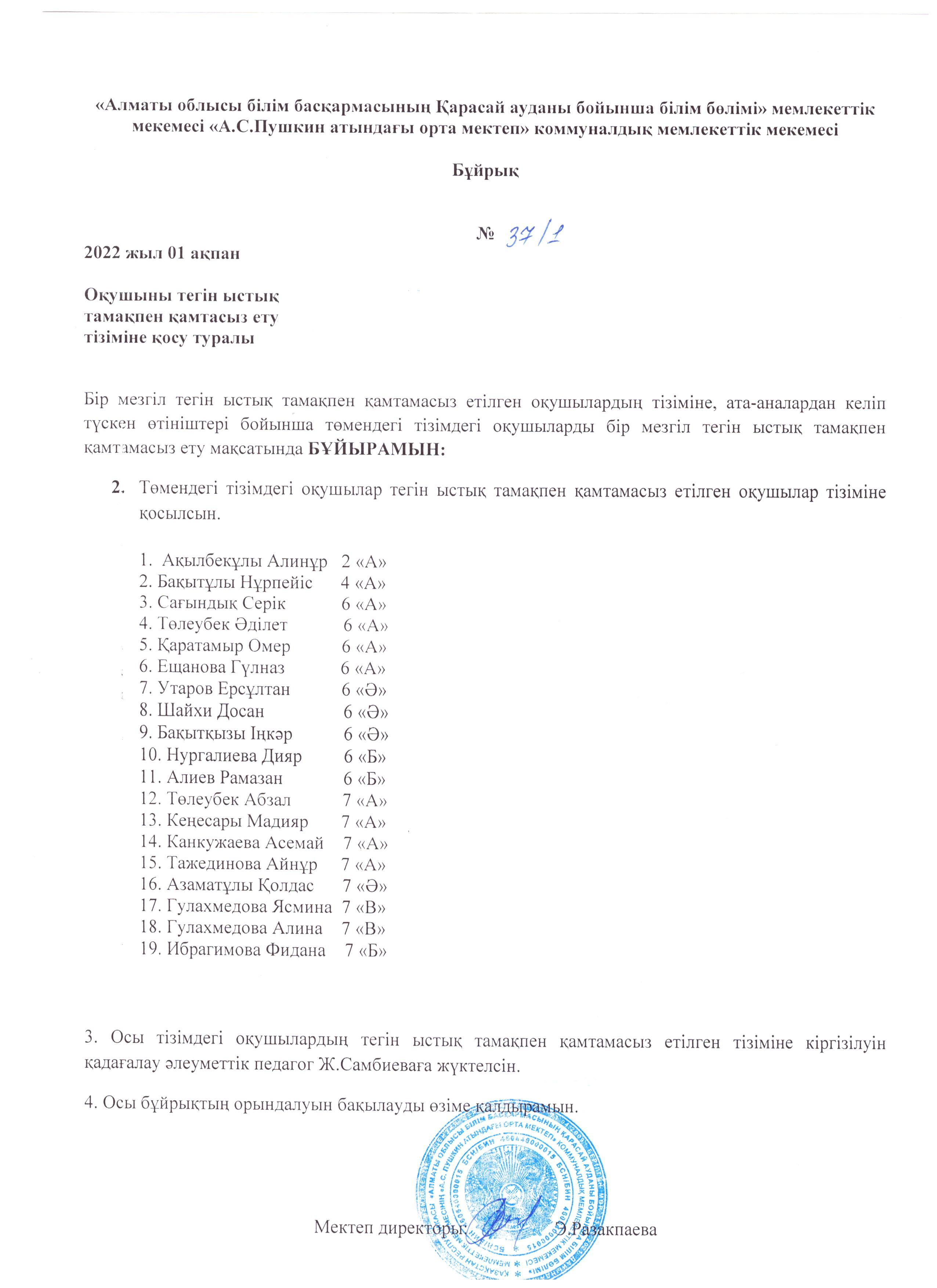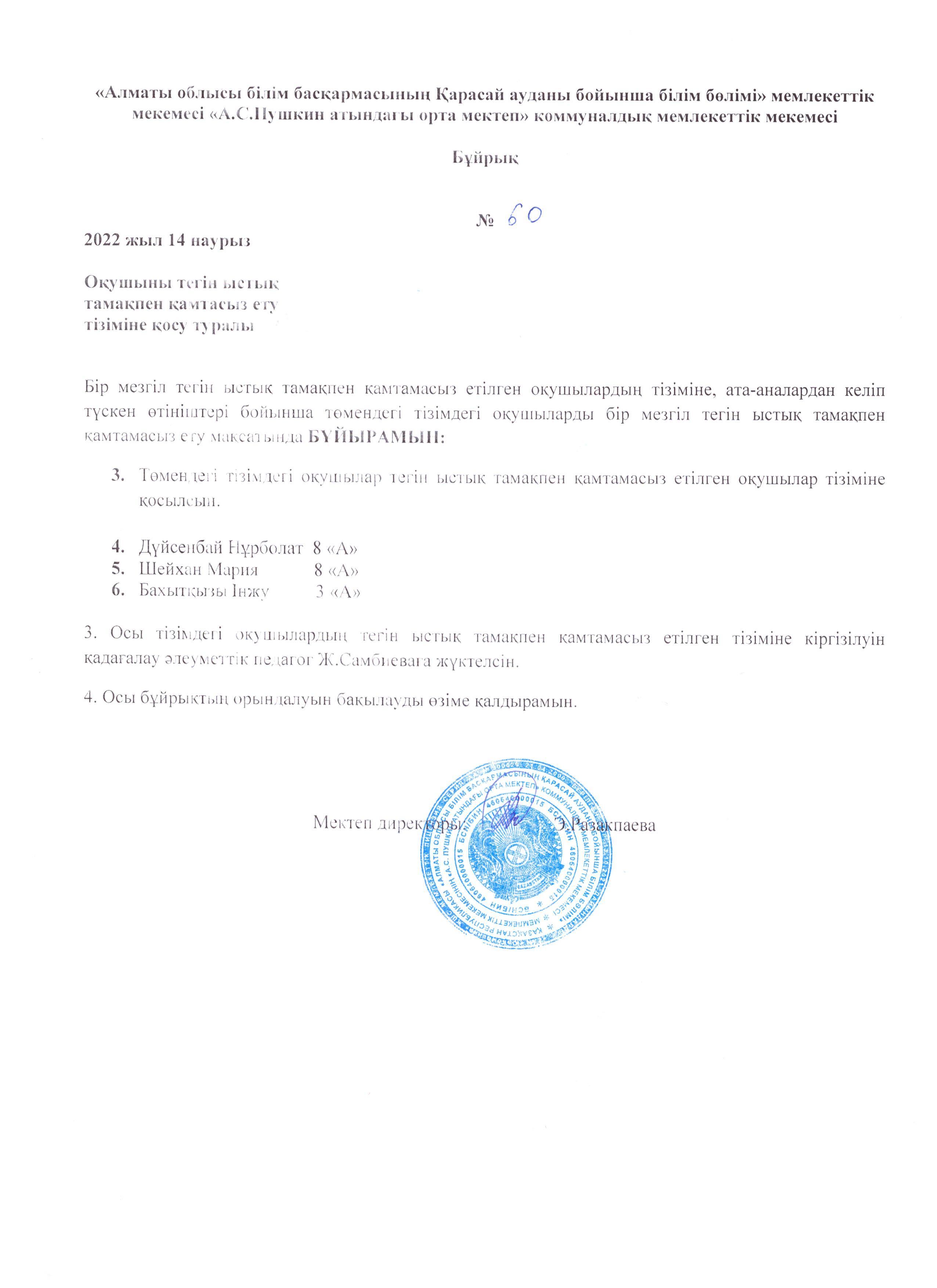 Оқушыларды тегін ыстық тамақпен қамтамасыз ету тізіміне қосу және шығару туралы наурыз айындағы бұйрықтары.. https://pushkin-karasai.mektebi.kz/pitanie/brokerazhdy-kommissija/298-oushylardy-tegn-ysty-tamapen-amtamasyz-etu-tzmne-osu-zhne-shyaru-turaly-nauryz-ajynday-bjrytary.html https://pushkin-karasai.mektebi.kz/pitanie/brokerazhdy-kommissija/298-oushylardy-tegn-ysty-tamapen-amtamasyz-etu-tzmne-osu-zhne-shyaru-turaly-nauryz-ajynday-bjrytary.html