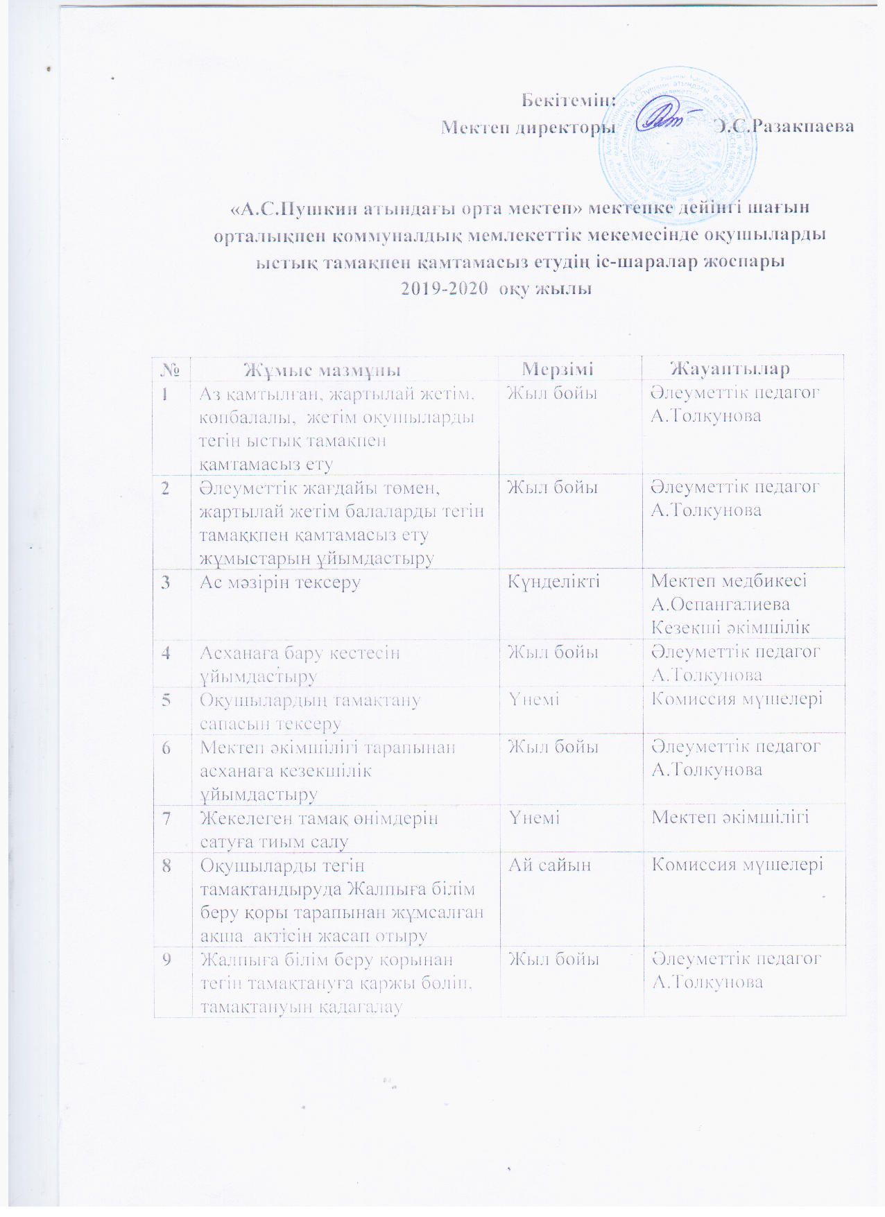 Ыстық тамақпен қамту жоспары » "Алматинская область білім басқармасының Қарасай ауданы бойынша білім бөлімі"мемлекеттік мекемесінің "А.С.Пушкин атындағы орта мектеп " отдела образования Кербулакского района